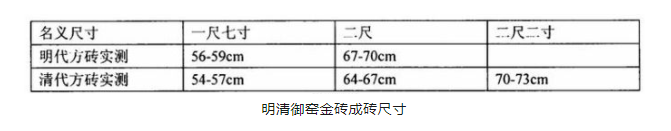 由此可以基本確定,明清御窯金磚均有“一尺七寸”、“二尺”和“二尺二寸”三種規(guī)格,其成磚的銘文標示尺寸和實際測量尺寸如下: